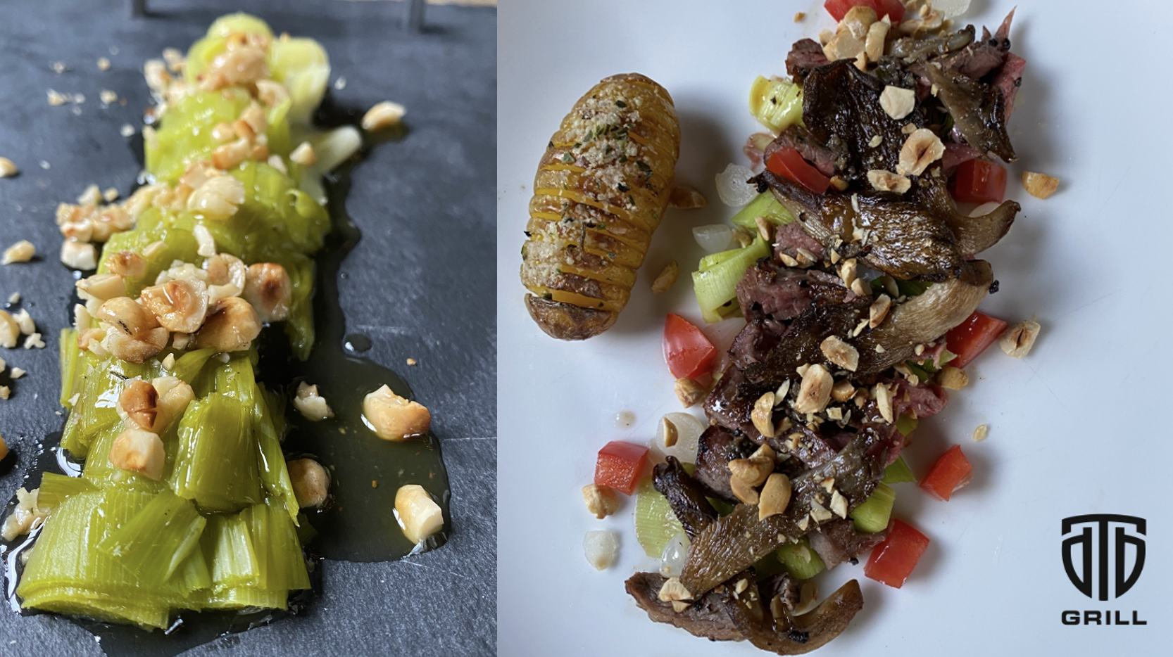 Gegrilde Prei met Gebruinde Boter, Geroosterde Hazelnoten en Truffel Tapenade van de DTB Grill
