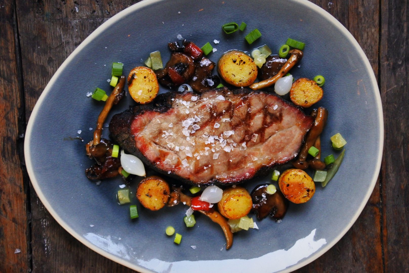10. Garneer je bord met gebakken champignons en gebakken aardappeltjes, en serveer met tafelzuur voor een fantastisch gepresenteerd gerecht!